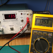 The constant current circuit is a simple N-channel MosFET with sense resistor feedback (using the 2N3904 to control the ‘FET). Knowing that there will be an ~0.6V drop between the NPN transistor’s base and emitter, we can calculate V=IR, or V/R = I, which gives us 0.6/3.3 = ~0.181A or 180mA through the LED module.